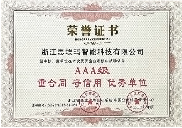 2021年 榮獲浙江省AAA級重合同 守信用 優(yōu)秀單位