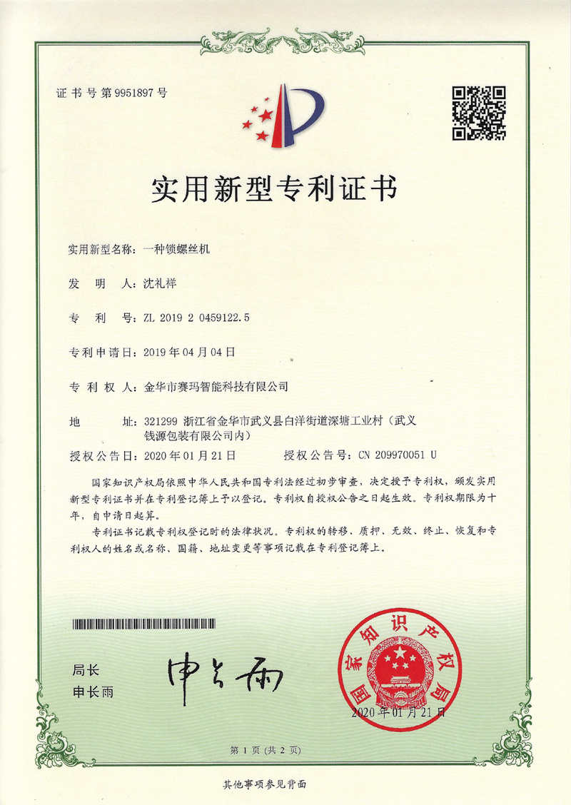 一種鎖螺絲機實用新型專利證書