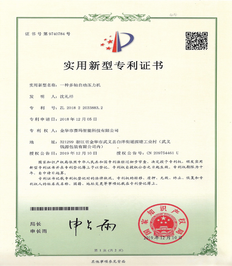 一種多軸自動壓力機實用新型專利證書