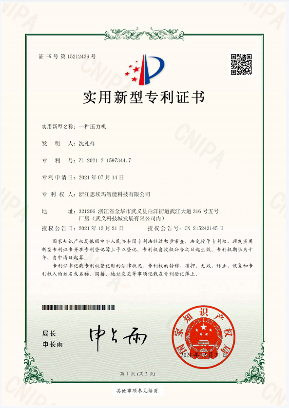 一種壓力機實用新型專利證書